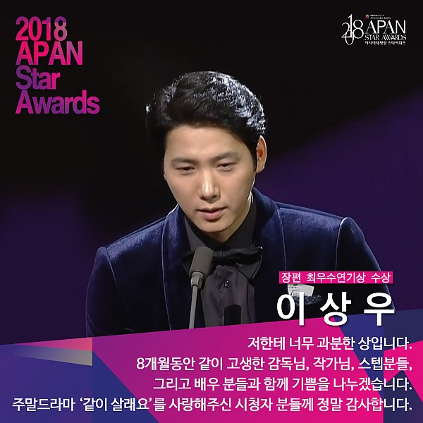 '2018 APAN Star Awards' 장편드라마 남자 최우수연기상 이상우 페이지 정보 작성자 연매협 작성일18-10-26 14:08 조회12,686회 본문 ▲ 장편드라마 남자 최우수연기상 이상우(KBS2 '같이 살래요') 이전글 다음글 목록